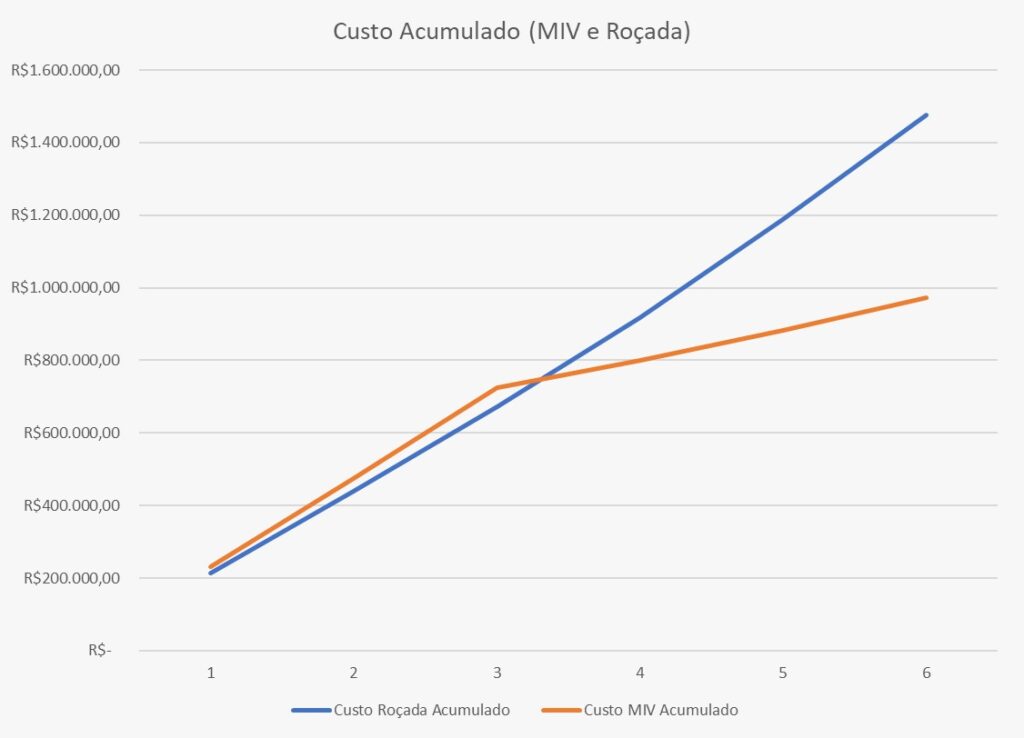 No início da aplicação do MIV o investimento é mais alto e vai reduzindo ano a ano. Após três anos de MIV, a redução nos custos com manutenção de vegetação é de aproximadamente 70%.